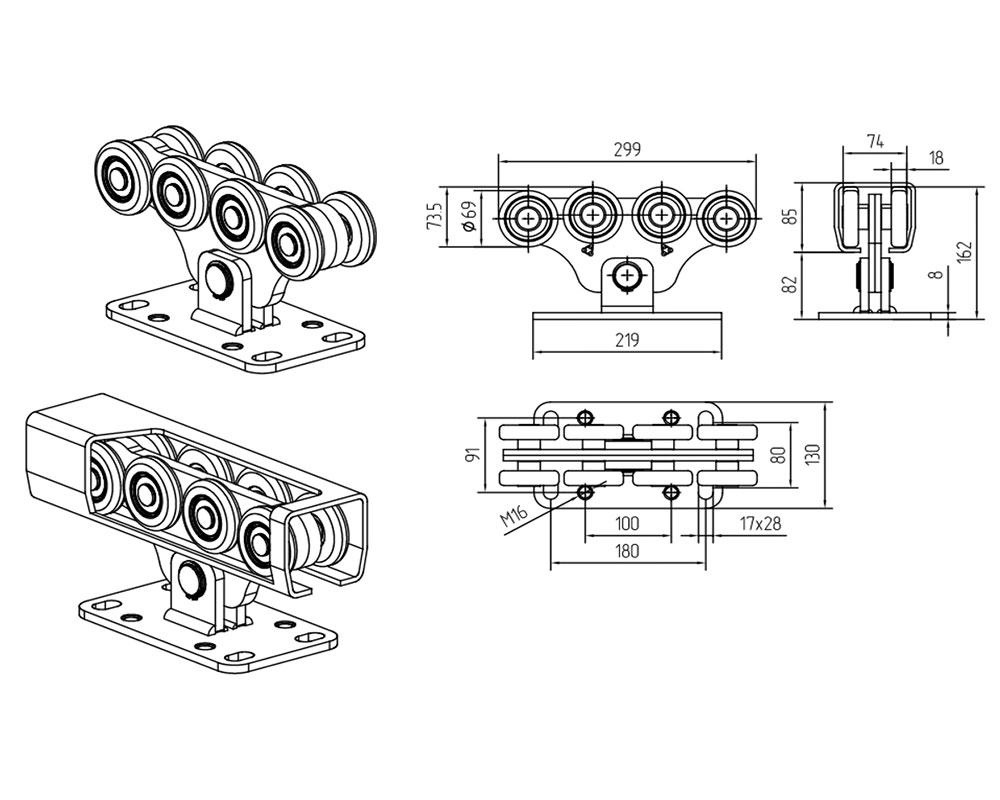 Опора с роликами из стали (для ворот с массой до 700 кг и серии SGN02, а также для ворот с массой до 450 кг и серии SGN01).